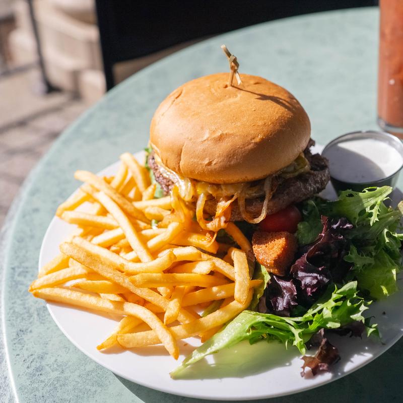 All burgers are ground chuck patties cooked to order and served with French fries and a choice of a homemade salad: Green Salad, Coleslaw, Potato, or Fruit.
