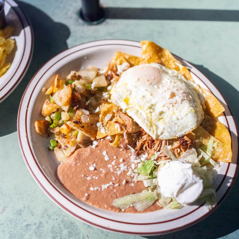 Crispy corn tortilla chips topped with two eggs, choice of Carnitas, Barbacoa, Chicken, or Carne Asada. Served with beans and rice.